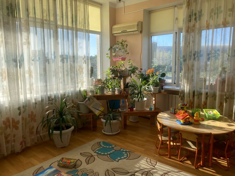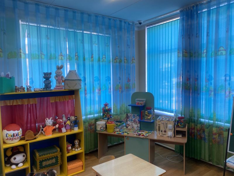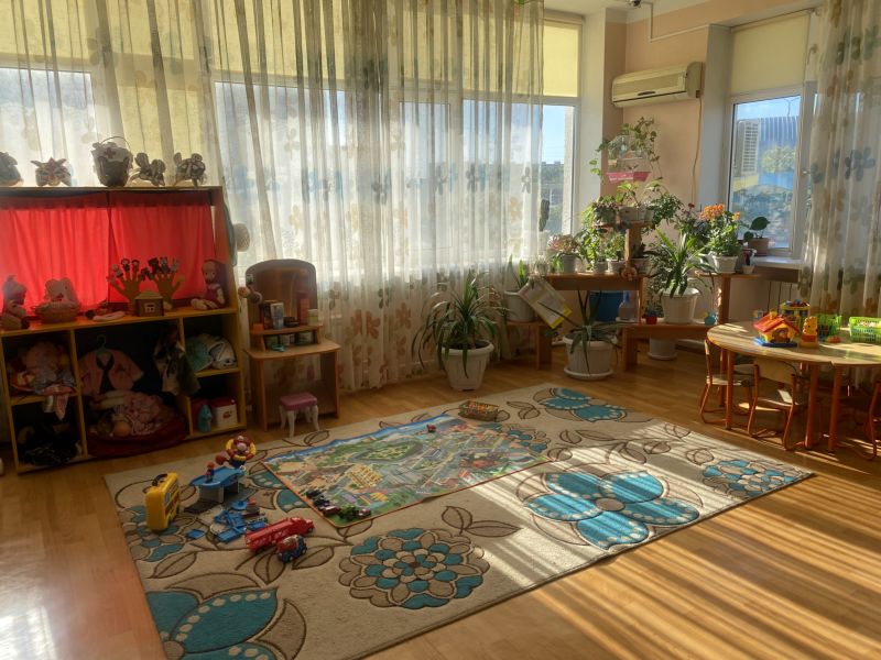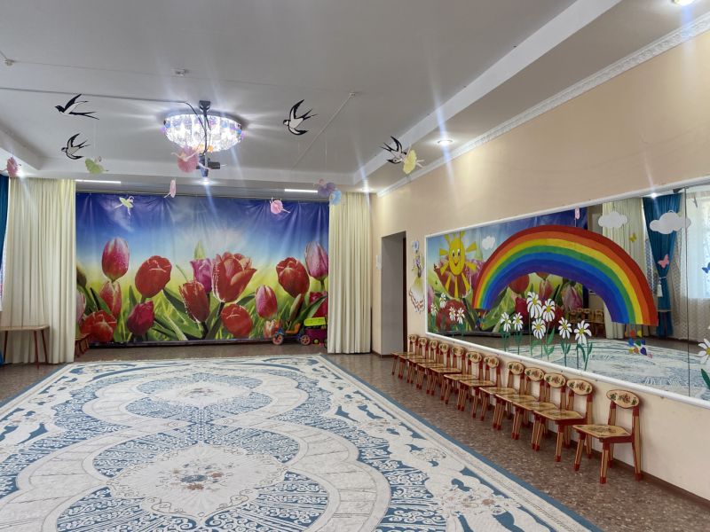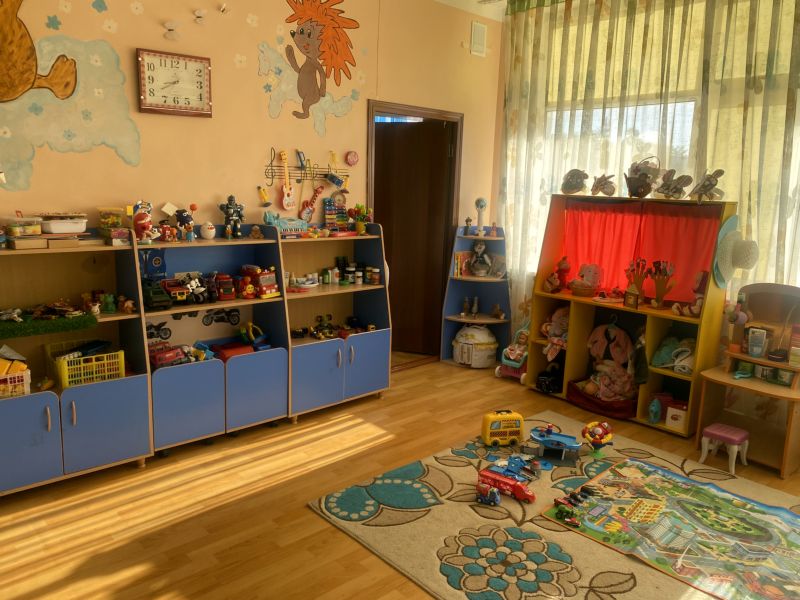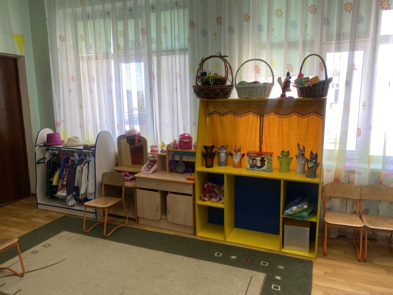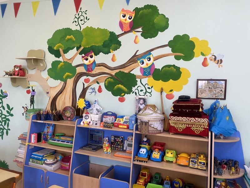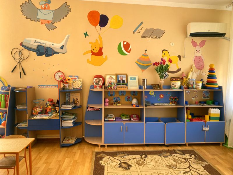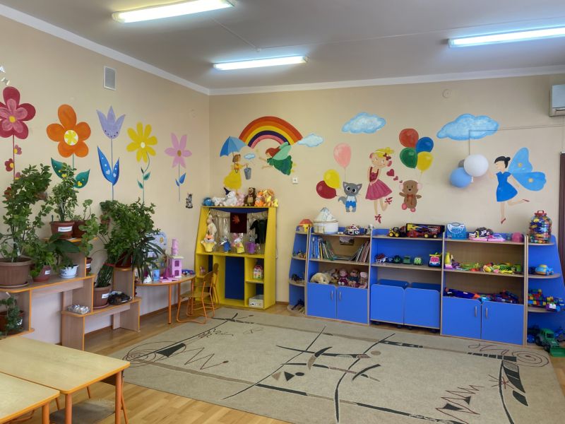 Ашық едендер мен қабырғалар кеңдік әсерін береді. Кілем, жиһаз жиегі, бір түсті схемада жасалған. Балалар үшін пәндік-дамытушылық ортаны құра отырып, топтағы барлық кеңістік белгілі бір аймақтарға немесе орталықтарға бөлінген: