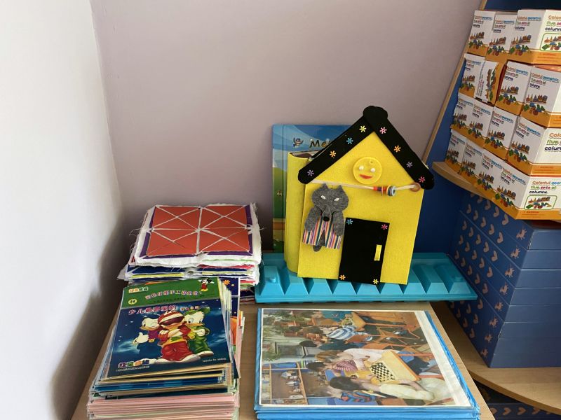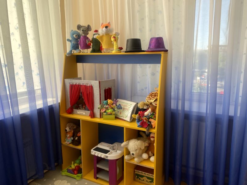 Топтың интерьеріндегі түс дақтары: кілемдер, ойыншықтар, жақтаулардағы плакаттар.